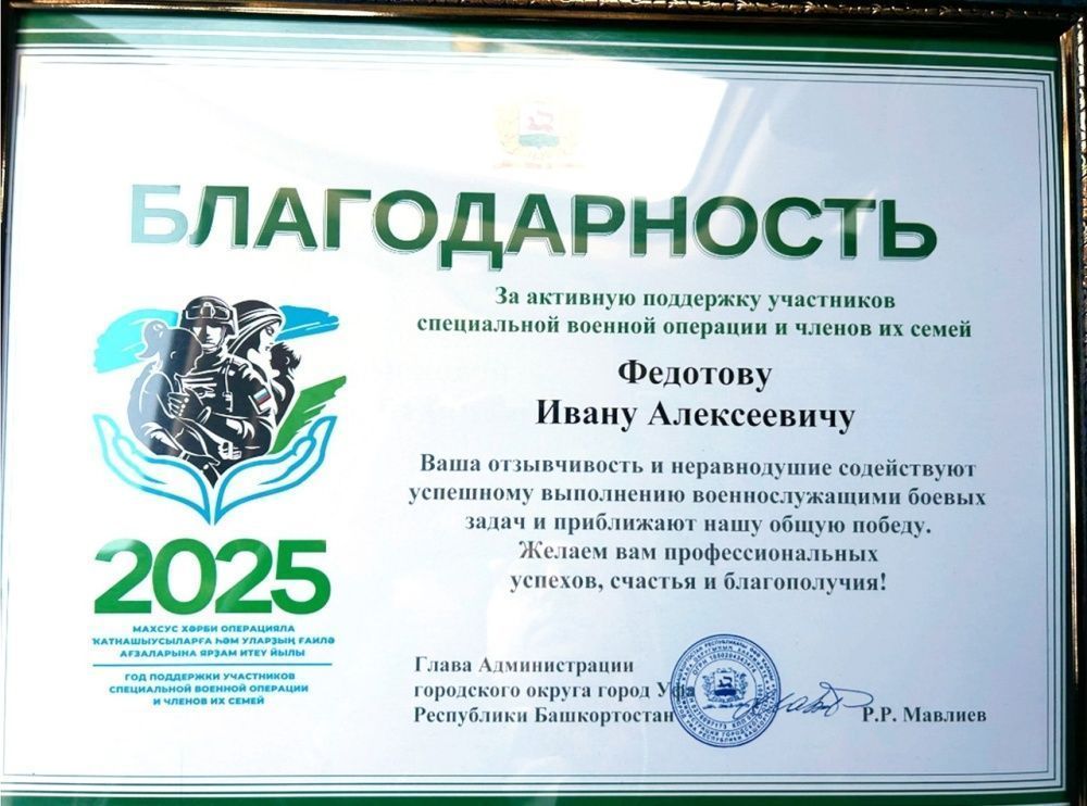 Главный врач городской клинической больницы Татьяна Васильевна Добрейкина сама в 2022-2023 году была врачом-волонтером в ЛНР. Она отмечает, что «в нашу больницу обращаются участники СВО, которым требуется медицинская помощь. Мы никому не отказываем, всем проводим необходимое обследование и лечение. Нашим бойцам важно знать, что их поддерживают, что о них помнят. А больница будет и дальше оказывать гуманитарную помощь участникам СВО". Яркий пример - заведующий отделением лучевой диагностики Федотов Иван Алексеевич сегодня был представлен к вручению благодарственного письма от главы администрации городского округа города Уфы Республики Башкортостан Мавлиева Ратмира Рафиловича "За активную поддержку участников специальной военной операции и членов их семей".