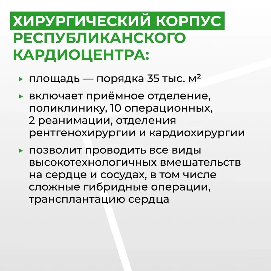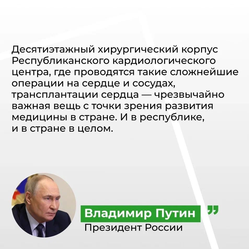 С Президентом России Владимиром Владимировичем Путиным открыли хирургический корпус Республиканского кардиологического центра. Это масштабный проект, над которым мы работали в течение нескольких лет и которого очень ждали наши жители.