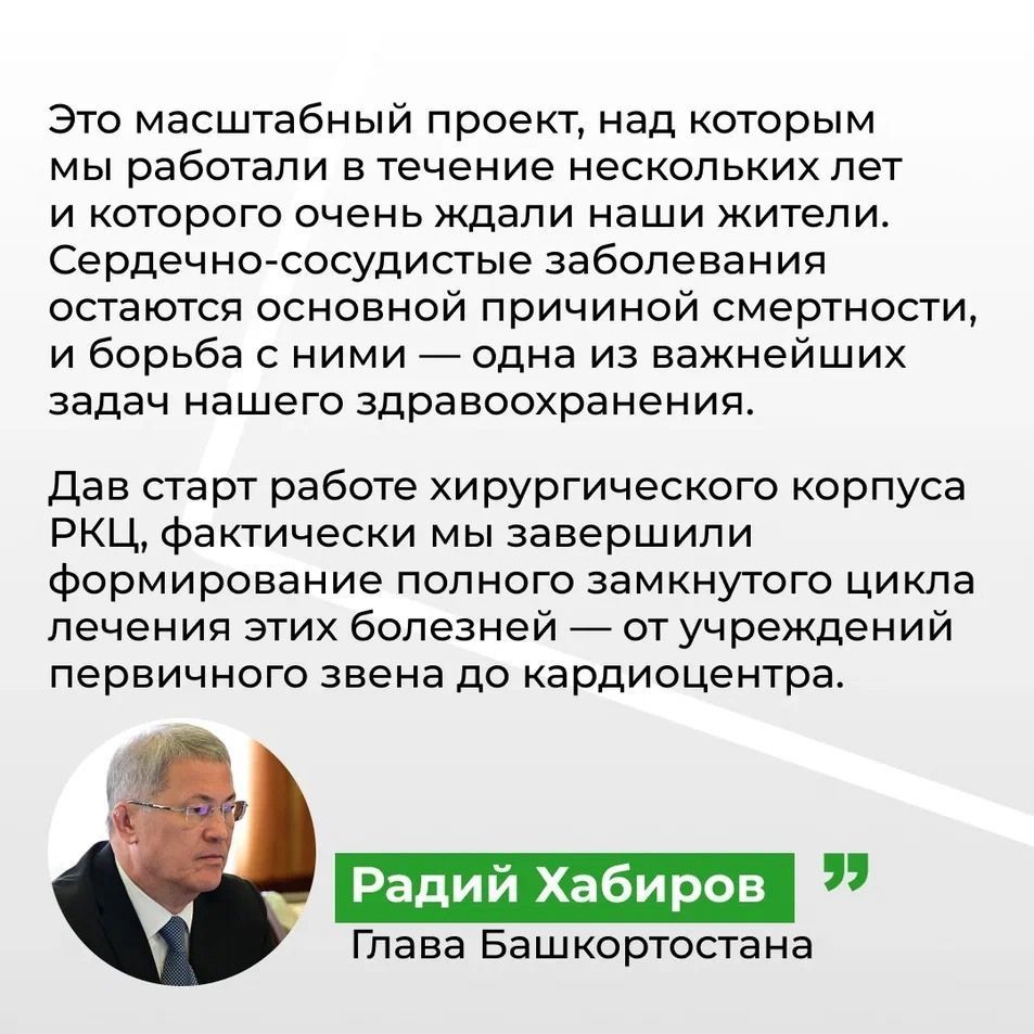 Сердечно-сосудистые заболевания остаются основной причиной смертности, и борьба с ними – одна из важнейших задач нашего здравоохранения. Дав старт работе хирургического корпуса РКЦ, фактически мы завершили формирование полного замкнутого цикла лечения этих болезней – от учреждений первичного звена до кардиоцентра.